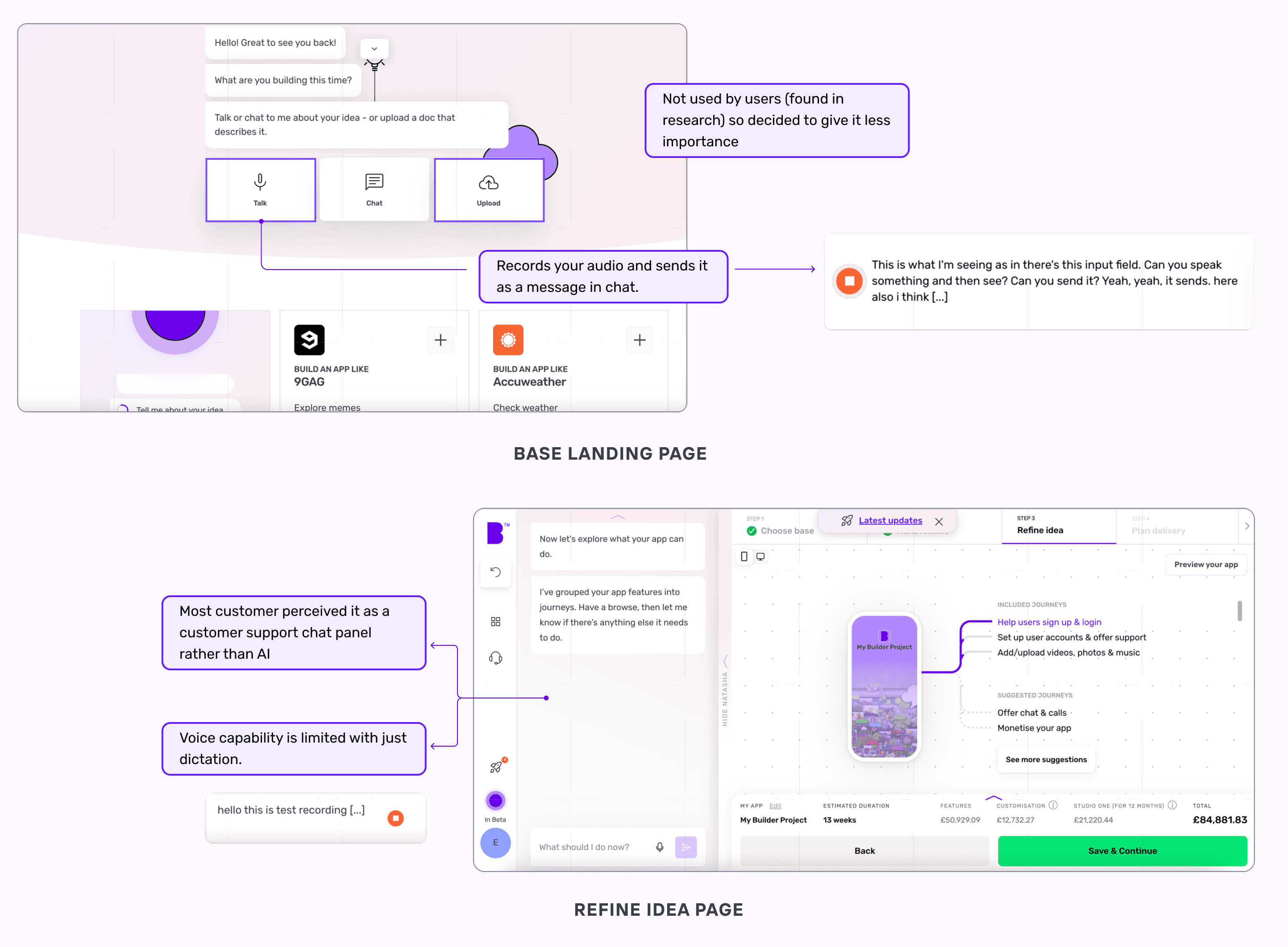 How I explored Builder Studio’s app flow by simplifying decisions, clarifying options, and enhancing usability—introducing VoiceAI assistance to make the journey more intuitive, reduce friction, and build confidence.