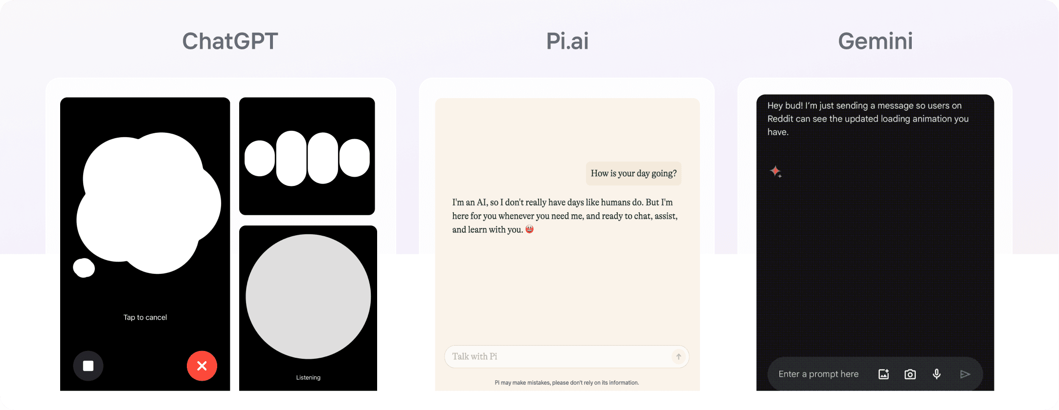 We drew from Gemini’s strength in handling long-form conversations, ChatGPT’s responsiveness in real-time scenarios, and Pi.ai’s one-conversation-at-a-time clarity, which ensures streamlined dialogues and minimizes user confusion.