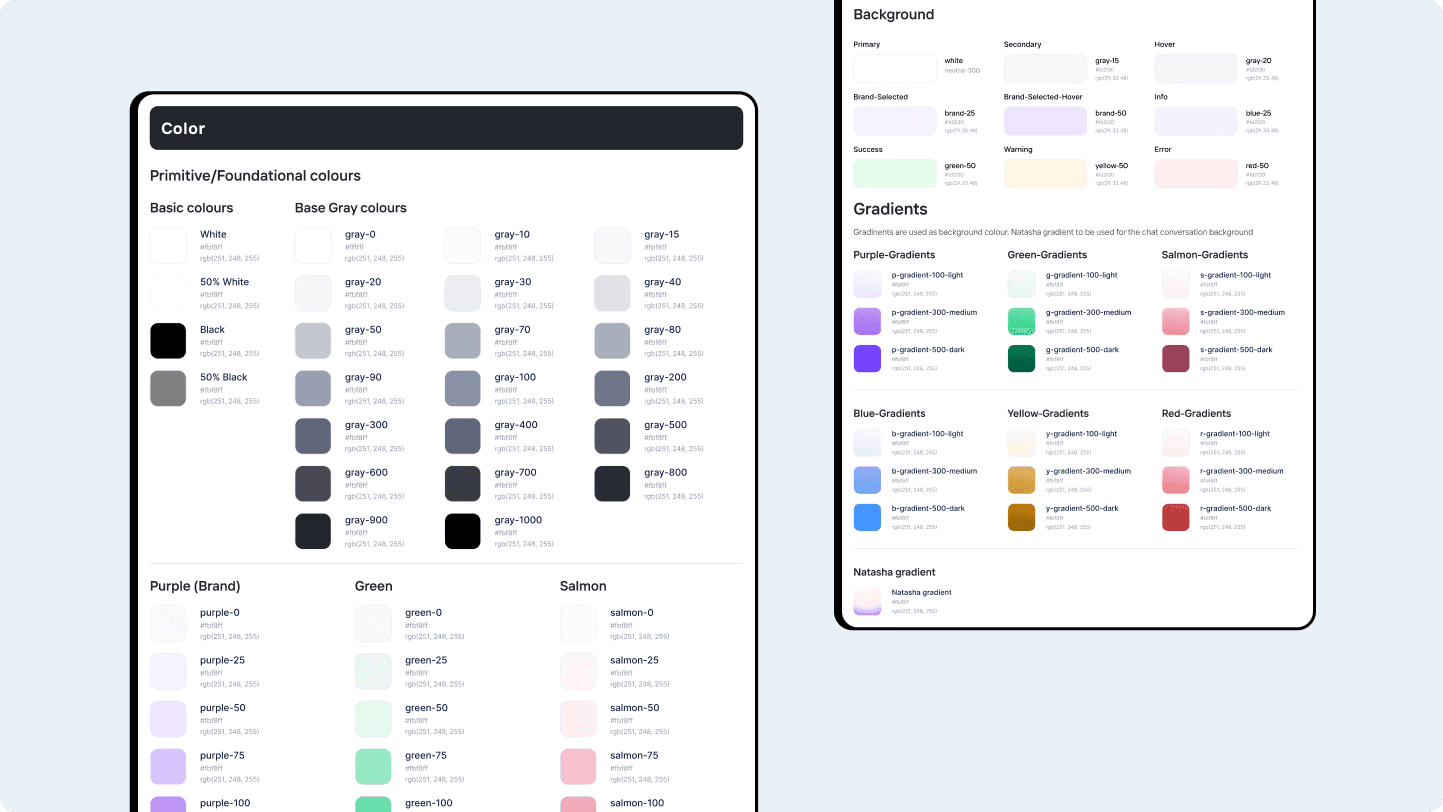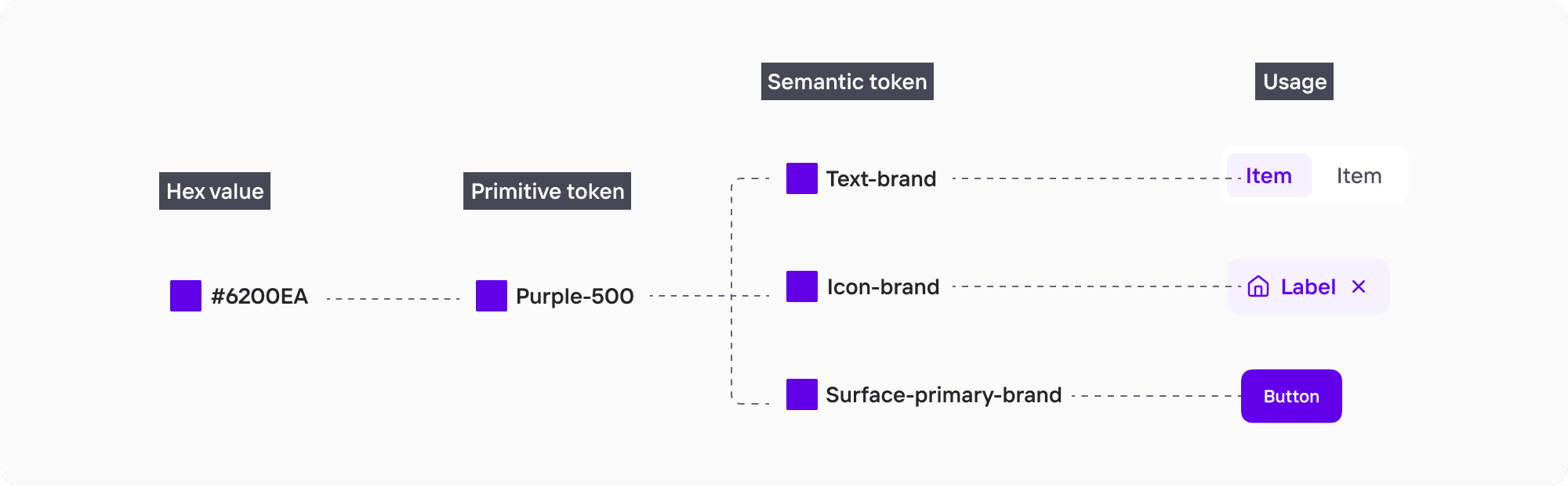 To modernize our design system, we adopted Figma variables and enforced the use of semantic tokens. Rather than relying on hard-coded values like #6200EA for our primary purple, we defined descriptive, purpose-driven names such as Surface-primary. This shift to tokenization not only improved clarity for designers and engineers but also unlocked scalable theming across products, reduced maintenance overhead, and established a future-proof foundation for evolving the system.
