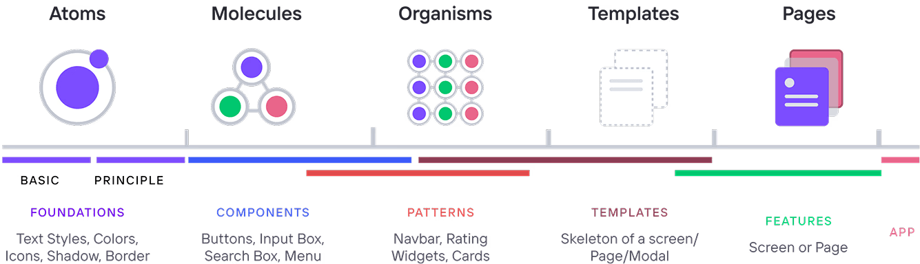 Following a similar model to Brad Frost’s Atomic Design, we modeled our Figma structure similarly and built all smaller components into its own library. Pages inside of the Atomic Figma were semantically named to also match the internal repository site, creating parity between Figma and code.